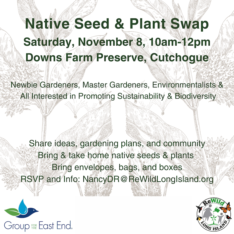 Sunday, Nov. 2 North Fork Poetry Society Reading at Poquatuck Hall | Friday, Nov. 7 Horseshoe Crab Talk with Group for the East End at Mashomack Preserve | Saturday, Nov. 8 Native Seed & Plant Swap at Downs Farm Preserve |